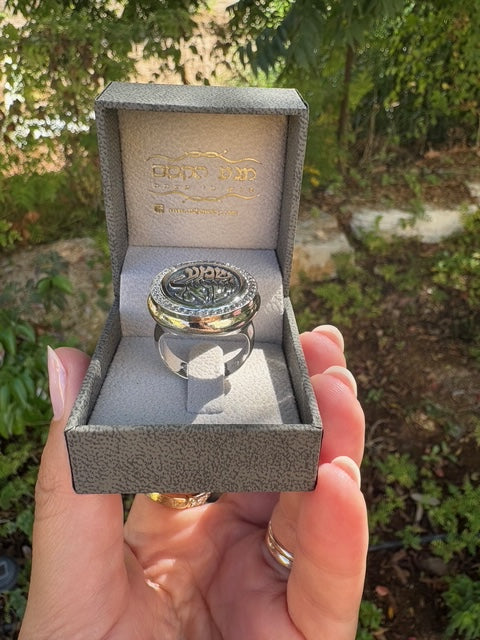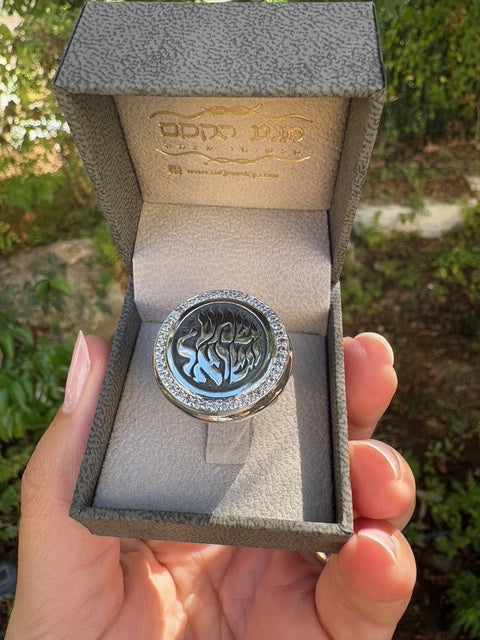 במרכז הטבעת חריטה בולטת של הפסוק הקדוש "שמע ישראל" – תפילה שמסמלת אמונה, אחדות והגנה רוחנית.